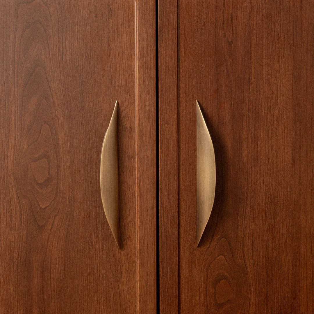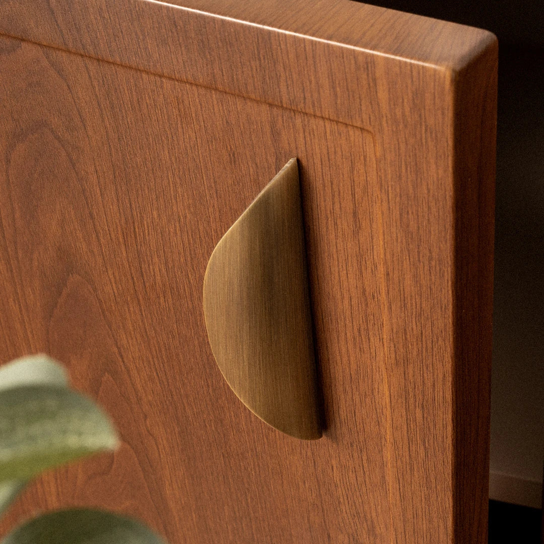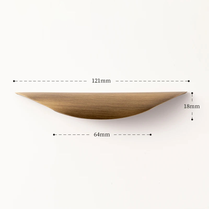 Refined and sculptural, the antique brass curved handles feature a smooth curved form with a brushed antique finish.
