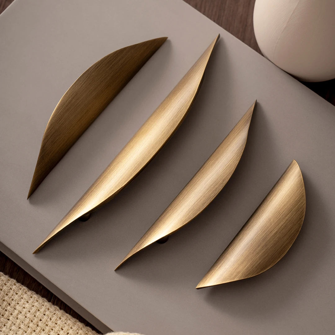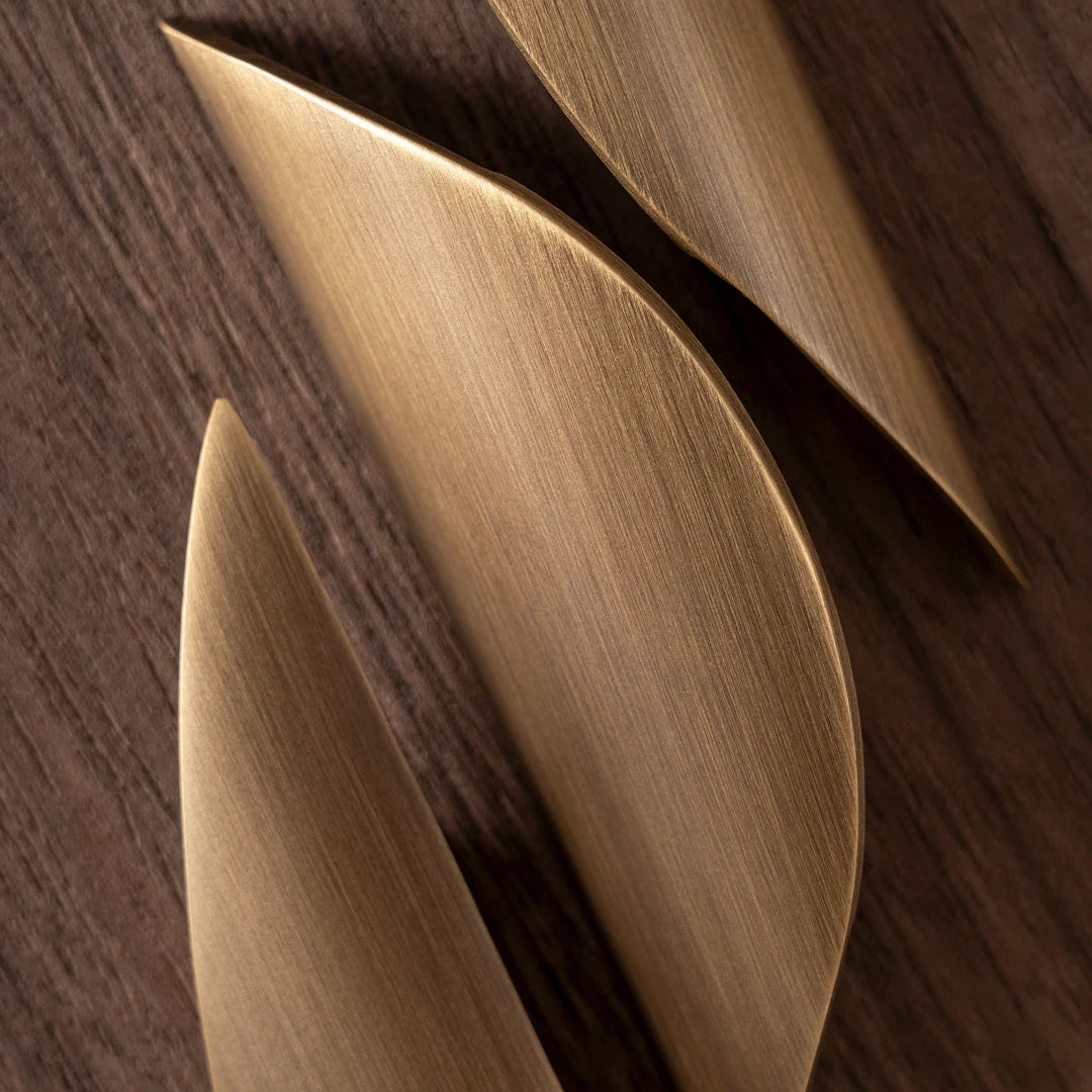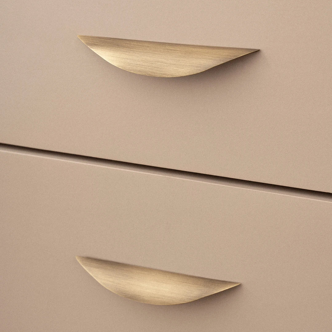 Refined and sculptural, the antique brass curved handles feature a smooth curved form with a brushed antique finish.