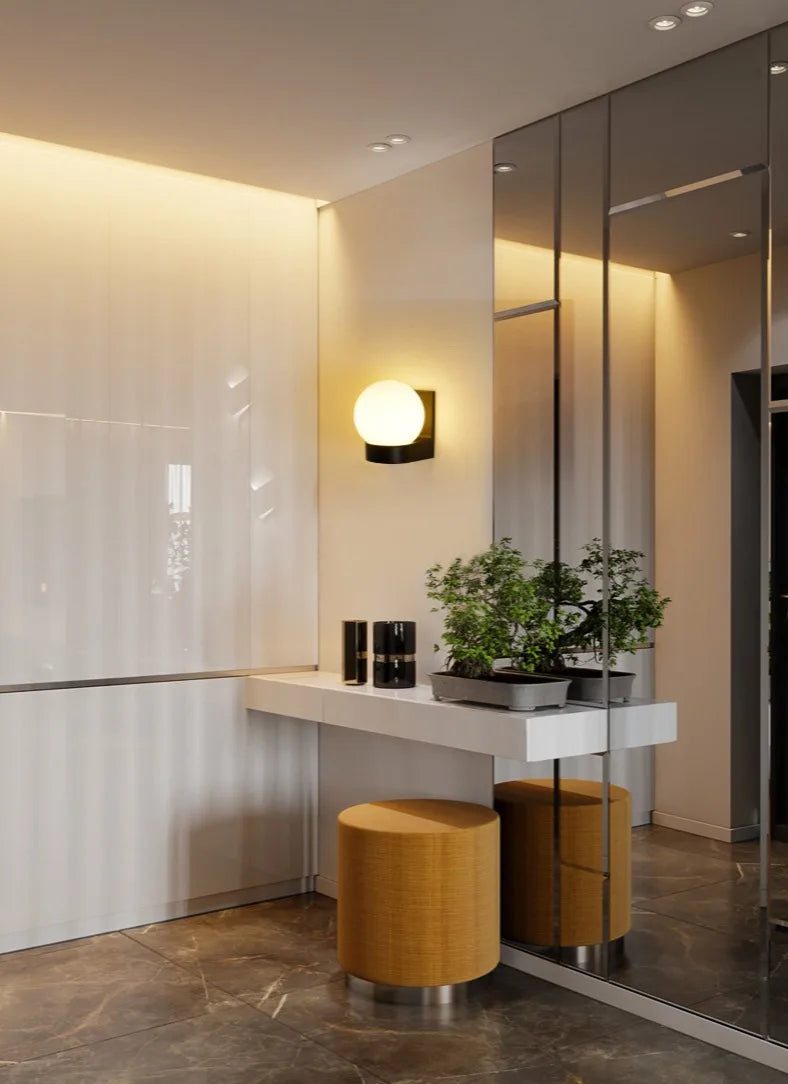 The spherical diffuser casts a warm, even light, making it ideal for entryways, patios, garden walls or balconies. With an IP65 rating, it’s built to withstand the elements while maintaining a refined finish.